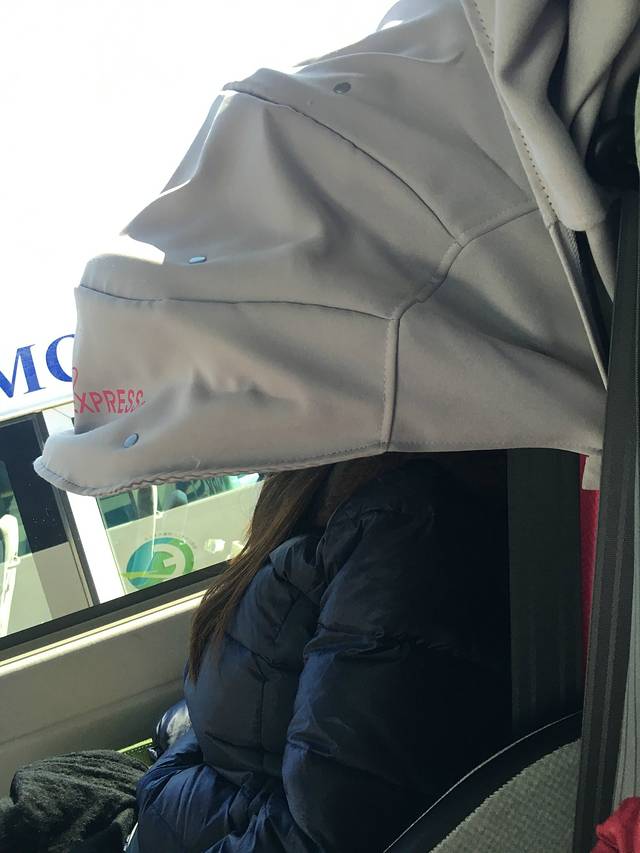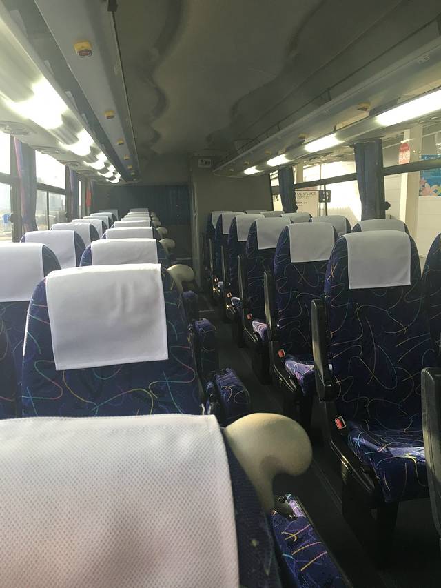 又跑回来找工作人员,售票处换了个男的,说明了情况,然后要我当场付款。妈的,能当场付款还要我去全家?还电脑上注册?骗会员啊这是。当时离发车还有8分钟,拿了票就去外面找到大巴坐上去了。每个座位都是婴儿车一样的。车上没有卫生间,所以中途会停一次。
