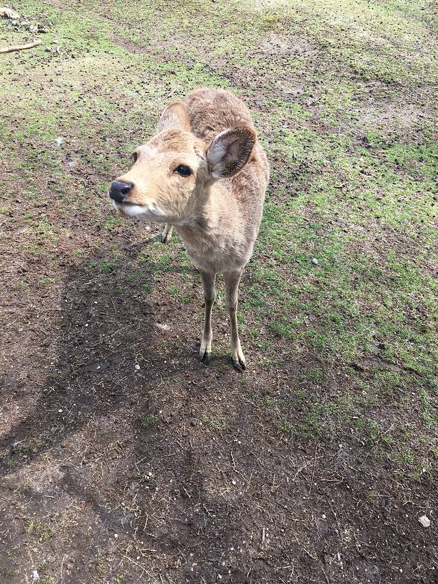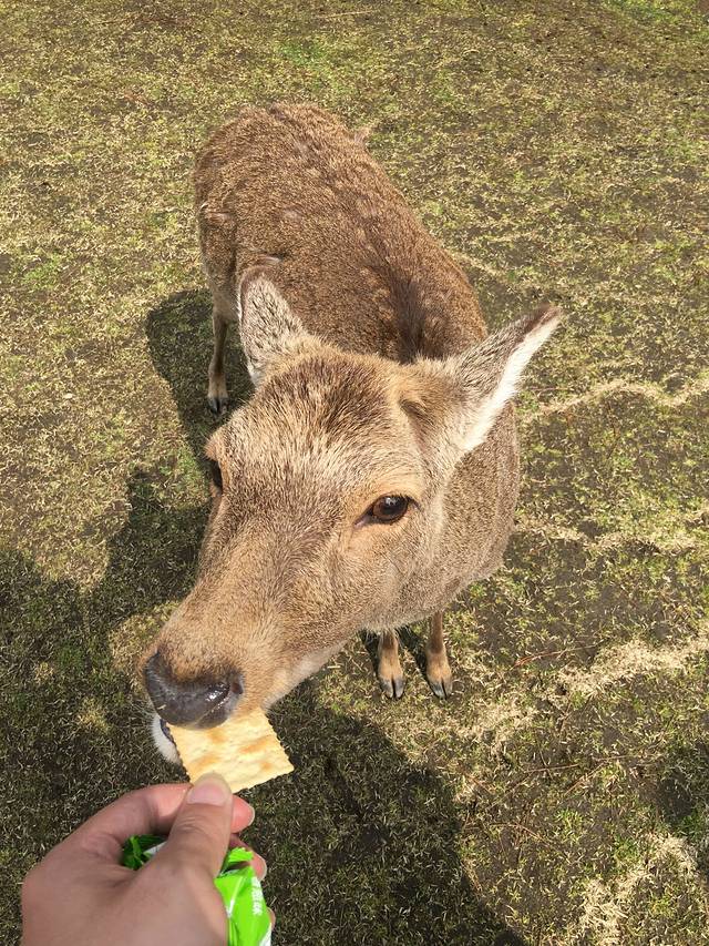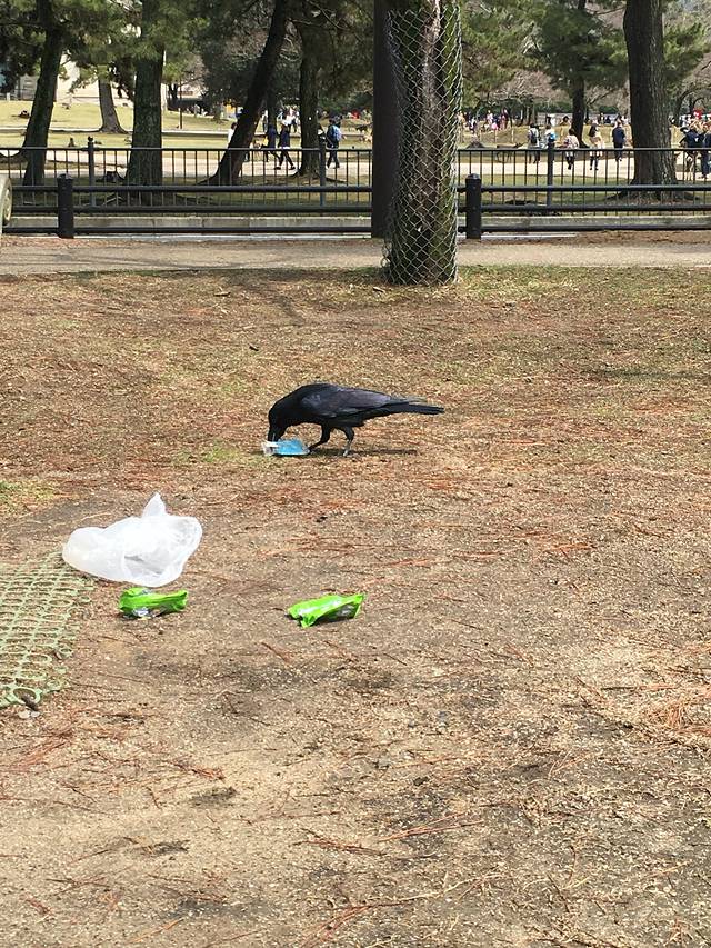 到了公园后,就是各种拍和喂咯。鹿饼150円,我们没有买。我想起包里有一包太平梳打,还有几包零散的饼干,试着喂了下,小鹿真的会吃哎。不止小鹿会吃,乌鸦也会吃,我把吃掉的饼干包装袋放到塑料袋里,放在了长椅上。在我们给小鹿拍照时,乌鸦会叼起塑料袋到地上,找里面的饼干碎屑吃。当然我把垃圾又重新捡起来塞包里了。