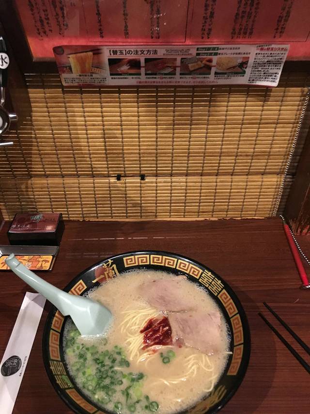 服务员会安排空位,按座位号找到坐下,衣服挂墙上,包放位置正上方。服务员会把勾选的单子收走,几分钟后面就端上来啦。毕竟是一兰,毕竟是那么多人排队的,好吃到爆。吃完要加面,按一下桌子上的按钮,服务员就回来收替玉的单子,过一会加的面就端上来了。但是这碗面比较硬,替玉不能选软硬程度,这个不太好。或者应该记住这桌客人刚才第一碗面的软硬度选择,替玉上同样的不就行了。