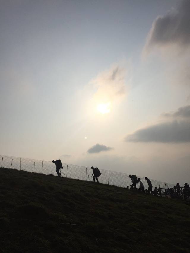 走到后面,在一座山的山脊上行进到另一座山。原来传说中的山脊,窄窄的一米宽的路,横跨两座山。左右两侧是各自向下的陡坡,风吹过,让人不由自主怂的蹲下来。幸好之前爬山练就了只低头看路,心无旁骛的本事,要不真的会被吓尿。