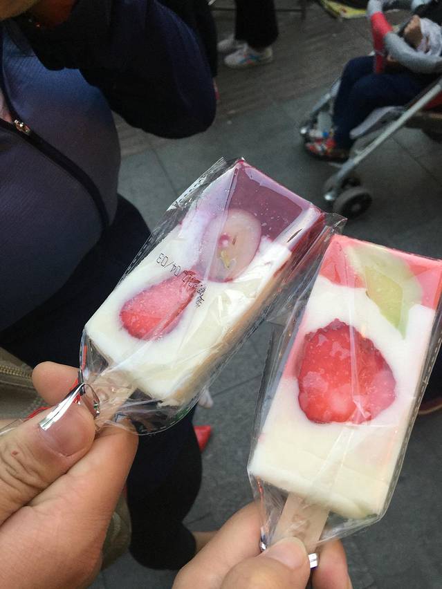 吃完午饭,回酒店睡觉,睡醒后出来继续吃。(我们就住在凌河夜市边上,白天看还都是车,晚上超级热闹。肠胃不好的人不建议吃哦)路上买的鲜果冰棍,10元/根。