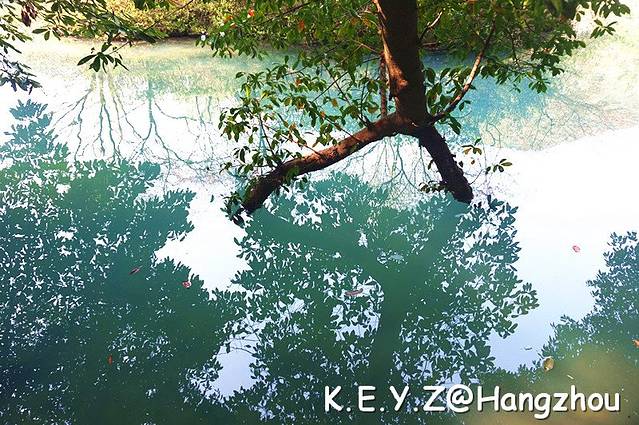 绕到烟树背面,发现几株樟树的树枝斜斜的长入水中,碧水倒影着绿叶,别致的很。