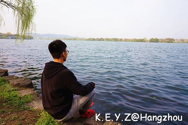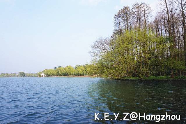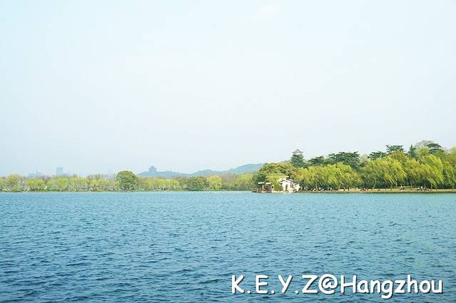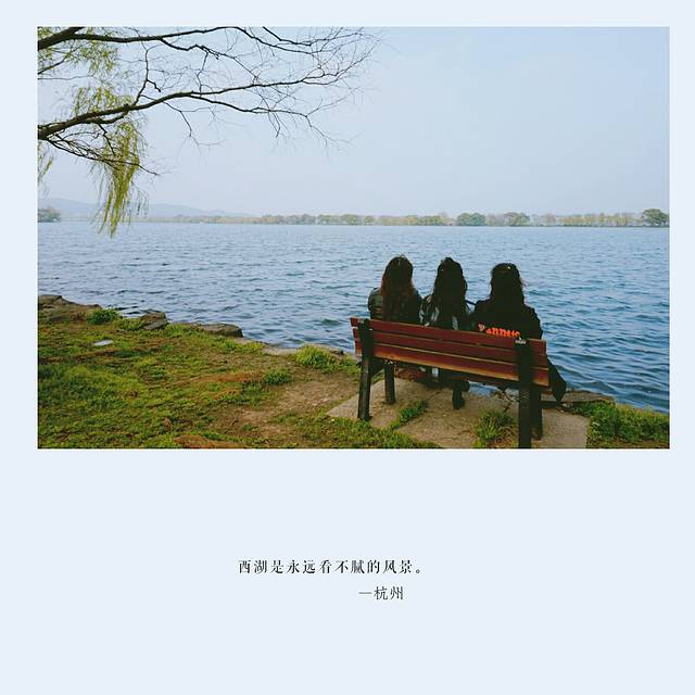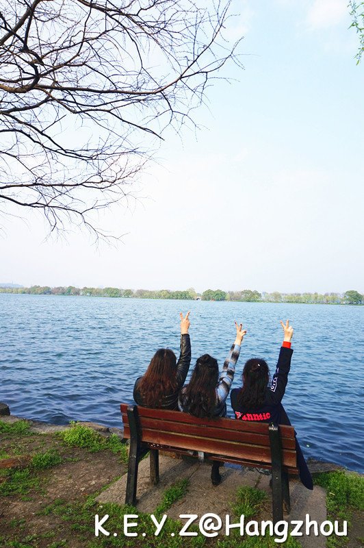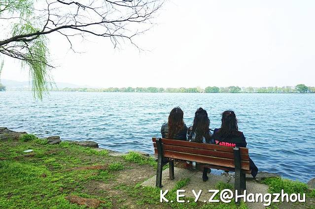 最终,我们寻到了湖边,面对着苏堤在长椅上坐下,一旁的柳条随风飞舞着,带着满是春意的新绿。忍不住哼起那著名的“渡情”:西湖美景,三月天呐,春雨如酒,柳如烟~