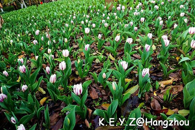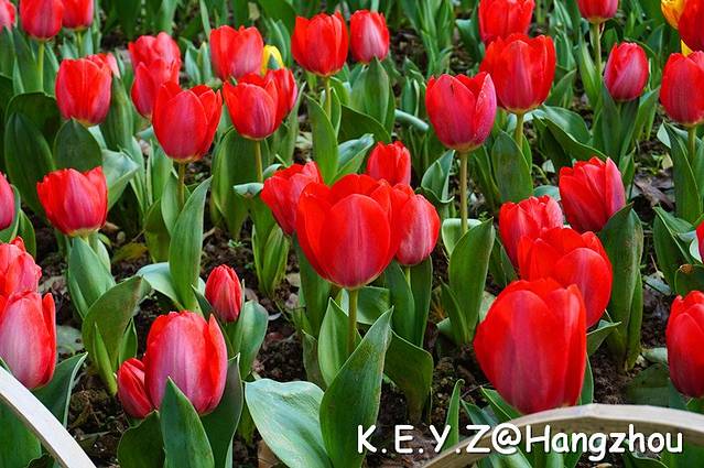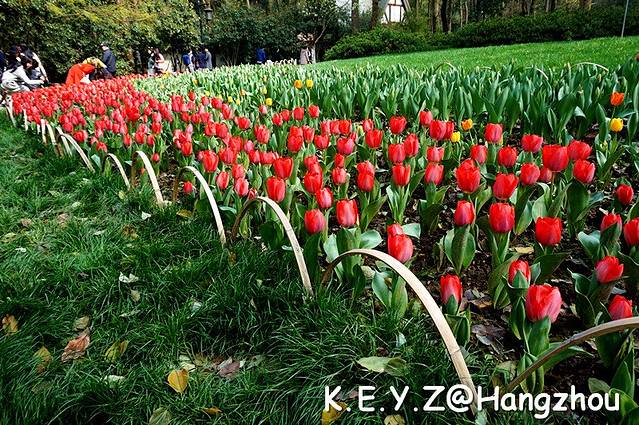 忽然,人流向林间小路转去,我们跟随其中,不远就看到一大片红色的郁金香,耀眼夺目。