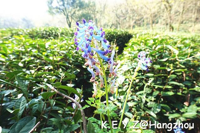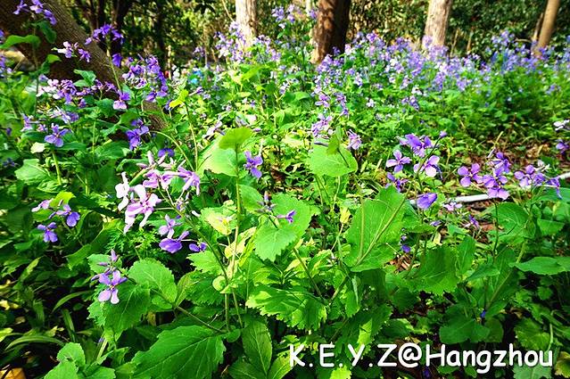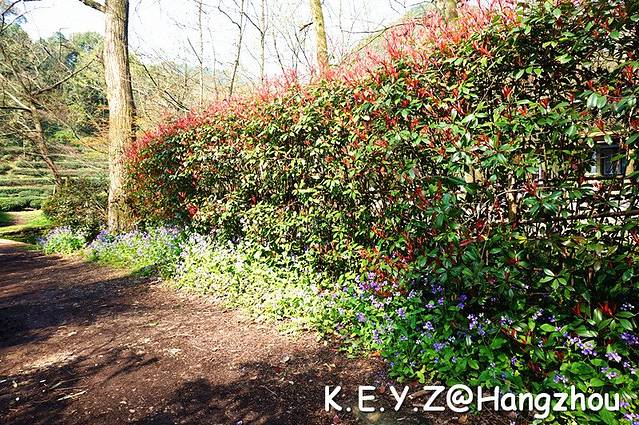 虎跑路两旁郁郁葱葱,有小溪随路延伸,紫色的小花肆意绽放,高大的树林间鸟儿欢鸣,间或有松鼠穿梭其中,在这样美好的天气里漫步此间,真是一种享受。