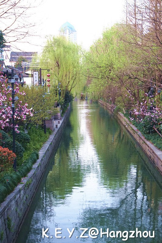 从酒店的后巷穿出来,是一条小河,两岸绿树成荫,其间点缀着各式各样的彩色风车,随风旋转,让人赏心悦目。我们沿着小河向河坊街方向走,看两岸桃红柳绿,小河清澈流淌,一阵风吹过,桃柳摇曳,水面泛漪,一切都透着满满的春意。