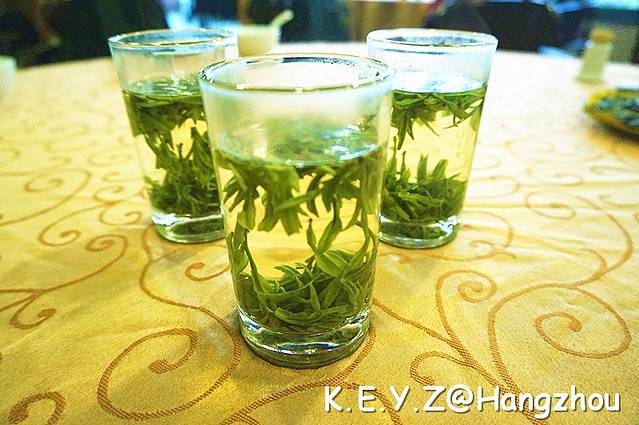 当然先要尝尝正宗的龙井茶,没有点最好的,点了一般的尝尝鲜。看着茶叶在沸水中翻滚,叶片吸水后丰盈起来,片片立起,散发出清香,在徒步之后,来上一杯,也算是一种享受。