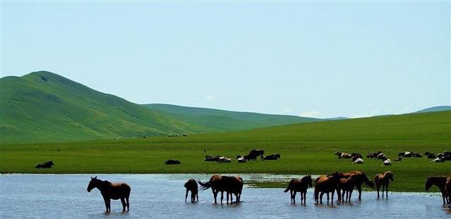 初到草原,这里的一切都震撼着我们的感官,无边无际,永远看不到头,淡淡白云映衬下的草原气势磅礴的雄姿完完全全地展示在我们面前,成群的牛羊…我仿佛不知用什么更美的词语去形容它,就知道原来电视里演的都是真的…大家不住的喜悦惊叹,不得不让司机大哥停下车,让我们在大草原中狂奔一下…各种抓拍,各种导演,各种美丽…留下了我们难忘的快乐瞬间!就是牛牛们看到我们都躲的远远的,可能我们打扰他们吃饭了!哈哈…