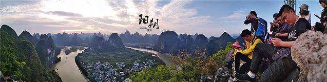 我本来就有点恐高,其次对拍照也没有太大的执念,觉得坐在石头上看看风景吹吹风就已经很满足了。谢先生就很开心地到处跑,找最佳位置拍照。如果想要看风景拍照片的话,在石头上确实最好。站在石头上,可以俯瞰漓江和兴坪镇。而在亭子上,则只能俯瞰兴坪镇,漓江被遮挡了。