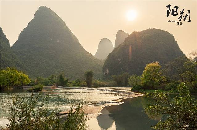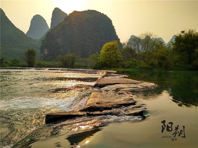 我们看到远处有个小桥,想过去瞧瞧。走过小桥,竟然就看到遇龙河了。这里刚好有一个小堤坝,原本平静的湖水在堤坝处倾泻而下,泛起粼粼波光。这里这么美,美得这么平静,那瞬间感觉这次来阳朔真得值了。这里既能让你原谅了之前的遗憾,又让你懊悔不已——恨不能来得更早。