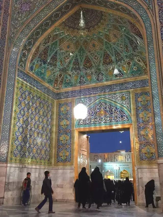 我到达马什哈德的时间尚早,于是我同穆斯林一样向城内最大的伊玛目里扎圣陵墓方向走去。这座圣陵在城中心位置,占地面积很大,内部有博物馆,清真寺,陵墓和其他建筑。我在当地人的帮助下把车子和行李寄存好,走向圣陵。刚到大门口就被工作人员拦住了,因为我是游客,不是穆斯林,于是工作人员打电话叫来了另外一位会说英语的中年男人带我进入参观,这位中年人一路上不停地向我介绍圣陵内的各个建筑的来历,我只听懂了很少一部分。