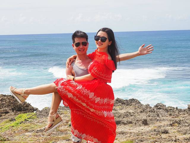 超喜欢这张照片,水清景美,重点是俩人恩爱甜蜜蜜的,旁边的还是世界上最大的活珊瑚哦!