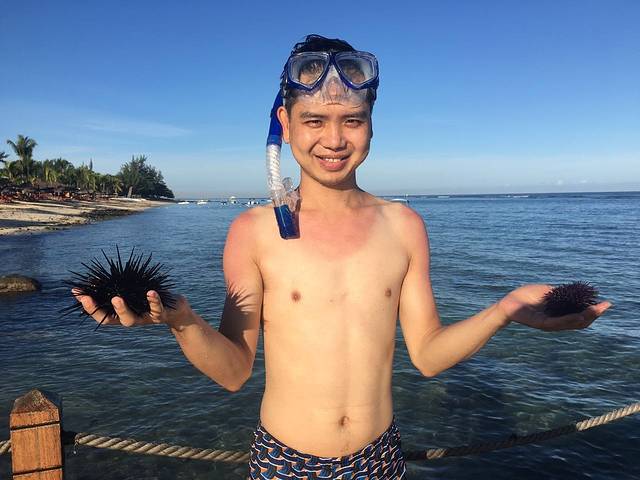 大松同学自打来到毛球的头一天,看到酒店海滩的浅水区有大片大片的海胆,就一直喊着要下水抓海胆,要知道这超近距离触摸海胆的机会对于生活在内陆城市的孩子还是很少见的。急匆匆回酒店换好装备(记得穿浮潜袜),就下水摸海胆啦!水很浅,大概到屁屁的位置,俯身把头潜到水里就能看到好多好多海胆宝宝,因为它们紧紧粘在石头上,一般用手是不能把它们抓起来的,需要借助硬物把它们敲起来,我们找了块大石头,一点一点地把它们凿出来。