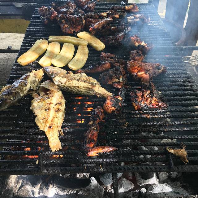 导游SKY说,这里有个不成文的烧烤原则,鸡翅皮不焦不上盘,所以每一只鸡翅膀的外皮都烤成黑黑的,但是味道出奇的好,超级超级好吃,赢得所有人的赞赏,鸡翅里面还带了点朗姆酒的味道,香软酥嫩全都有了,吃货表示满足到不行!另外,烤鱼和烤香蕉也很不错,是因为当地盛产朗姆酒的原因吗?感觉每一样都加了一点朗姆酒腌制,味道特别香,大家有机会一定要试试!