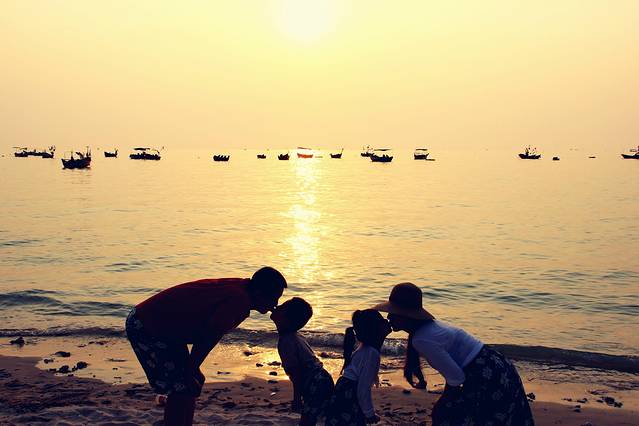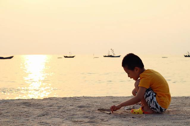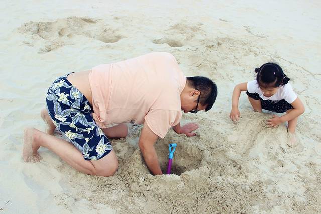 等孩子们午休起来,太阳也不感觉那么晒了,就出发去银滩啦!!银滩的沙真的好细好细,又白,孩子们好喜欢,玩到天黑,衣服裤子都湿了也不走,我们又骑电瓶车回去取的衣服给他们换,真是玩嗨了!