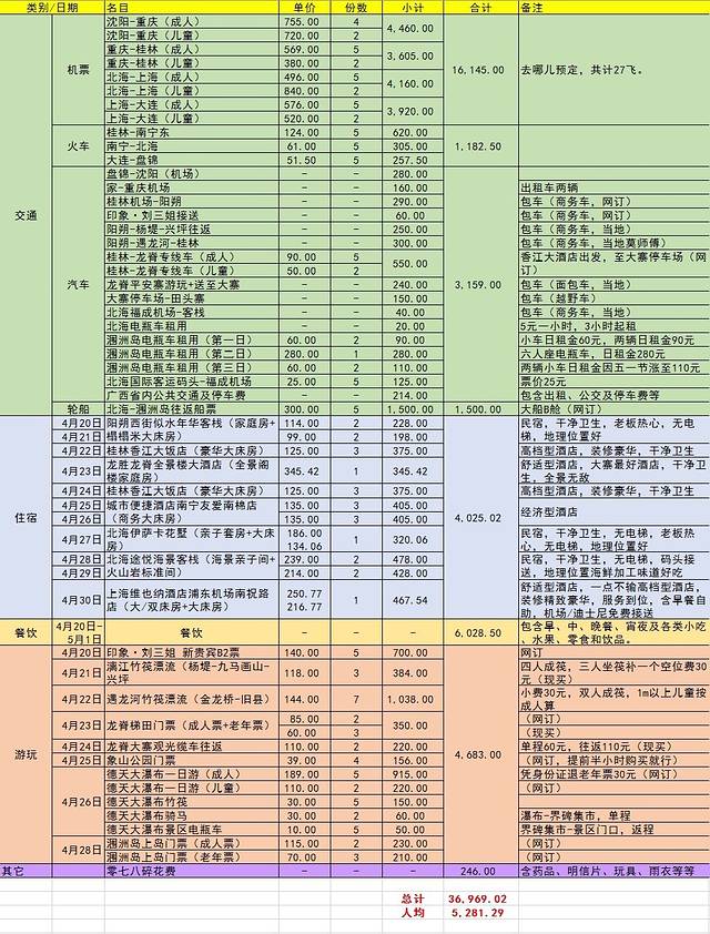 旅行一共12天,5位成人2位小孩,除去手信,共消费36969元,人均5281元。