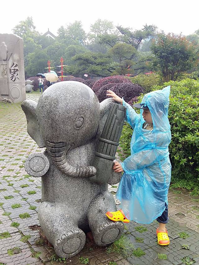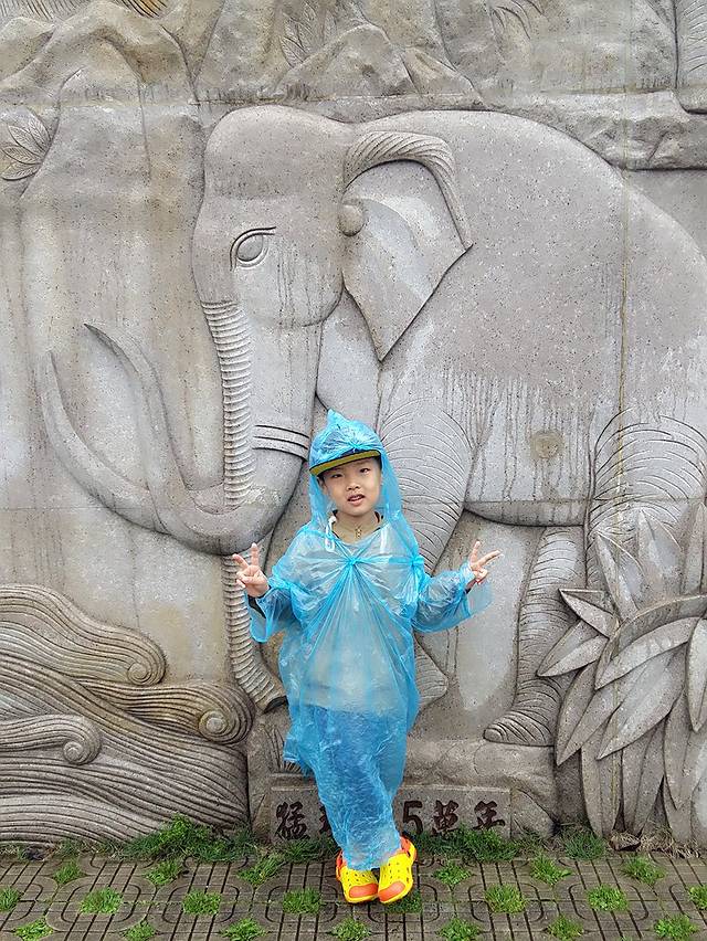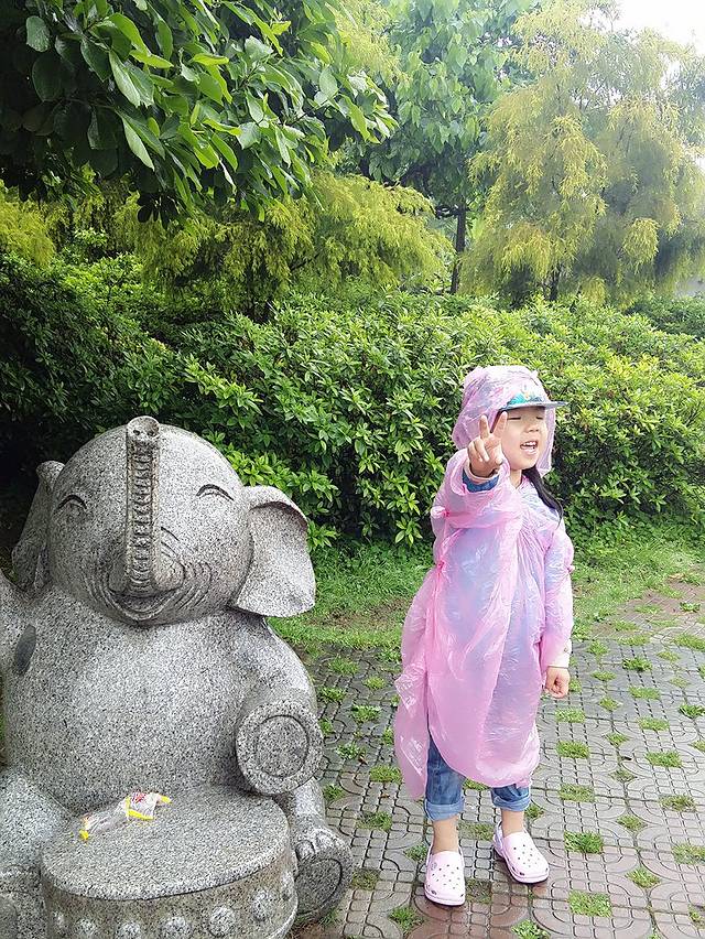 因为下雨(雨还不小),还要顾老人和孩子,就没怎么拍照。孩子倒是玩得开心,下雨可以踩水,公园里江边可以玩水,还有很多可爱逼真的大象雕像。俩宝贝穿着雨衣,衣服裤子也都湿了。
