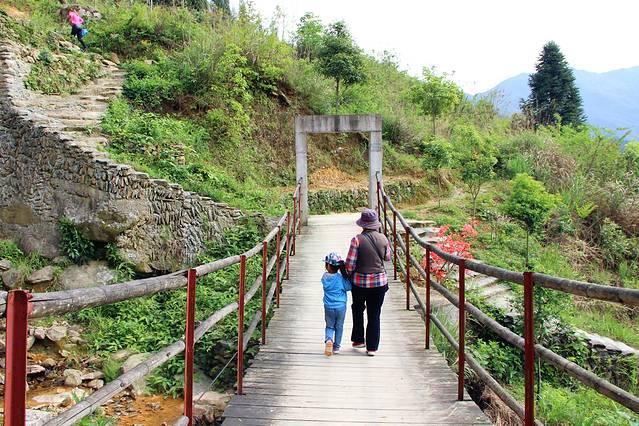 山间路是这样的,看着近,但会感觉怎么还没走到;村寨里的人说10分钟路程,一般得20-30分钟。要我自己玩,肯定就步行上下山了,但带着老人小孩,没法累,所以整个旅途中我们在包车这项上花费较多。平安寨包车到山顶的九龙五虎观景点,再徒步游览梯田下山,说是下山,但山间穿行也还是会爬坡;包车至大寨停车场,再包越野车到田头寨,再往上只能徒步,至全景楼酒店步行约半小时。