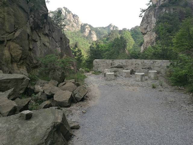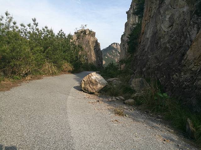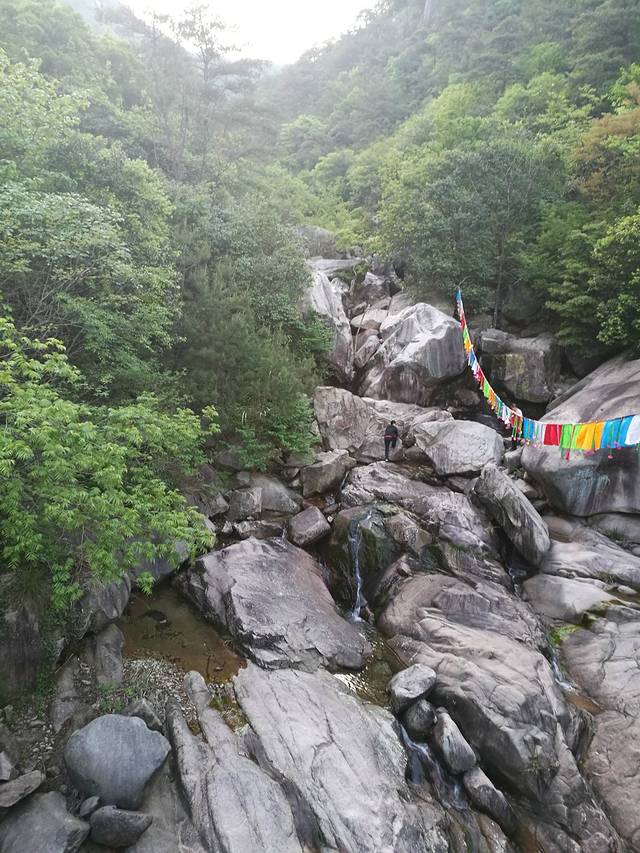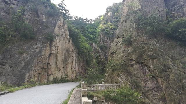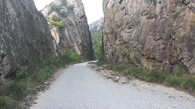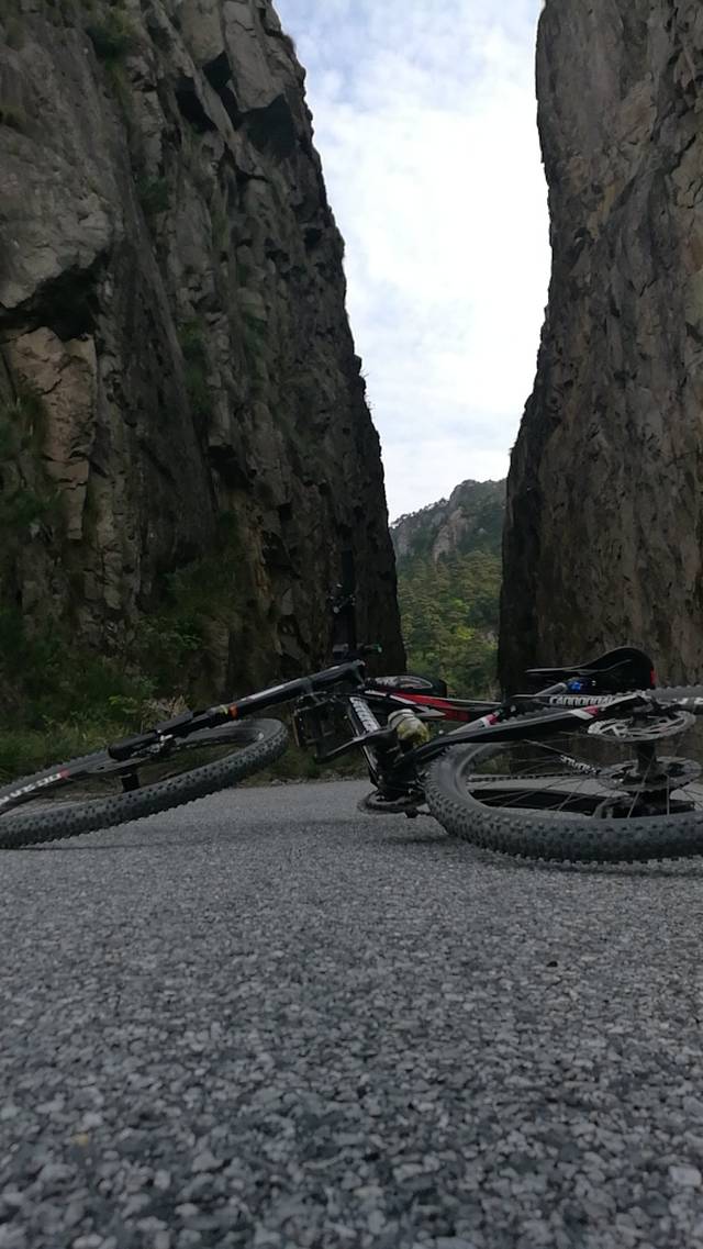 虽然路很烂,但是下山的速度还是很快的,没用半个小时就到了凤凰松附近,相当于九华山景区的后大门,远远的看到后大门有一个值班室,正好有五个穿制服的走出来,在路中间一字排开背对着我向前走,我远远的看着心想这里是能不买票进去的地方吗?这时候其中一个人回头看到了我,几个人居然会心的笑了,那意思好像他们等了很久终于等到一个差点逃票成功的,我痛快的买了景区门票,他们告诉我现在五一管的很严,平时这边根本没人值班,真不用买票。其中两个小伙也喜欢骑行和户外运动。