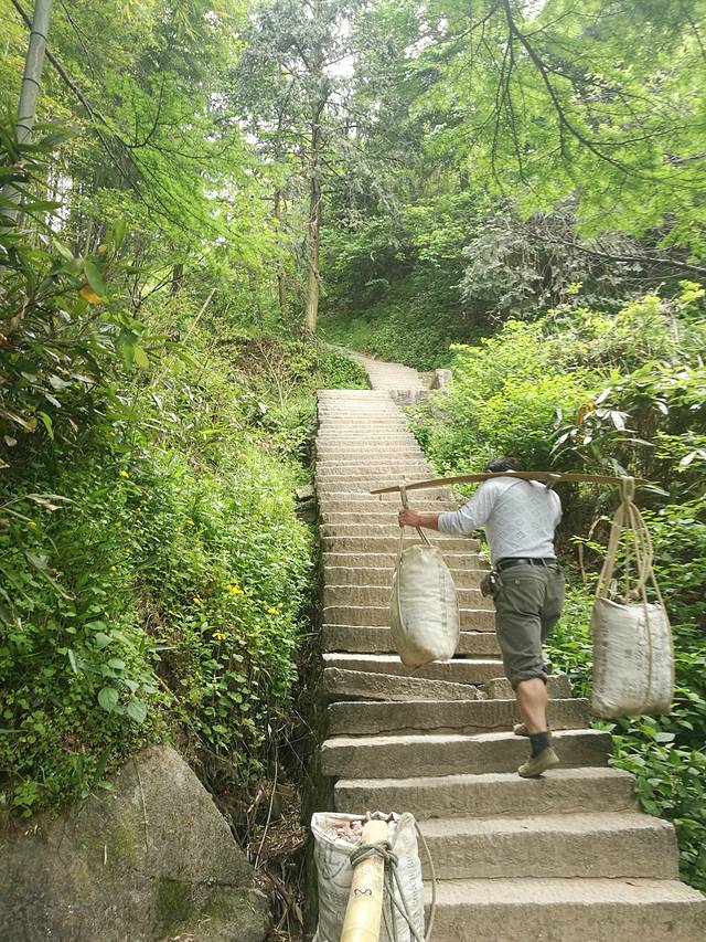 挑山工,休息的时候和他聊天,这一担两百多斤,一路台阶抬上三百米外的维修寺庙里,这三百米要休息五六次,一天抬只能七八趟