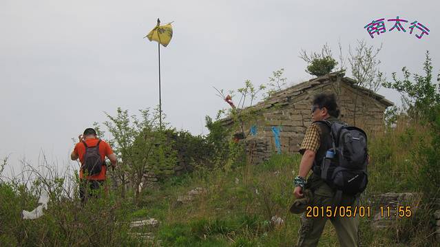 过了夹驴缝向上切了一个路口,渐渐地到山顶了,大家十分兴奋看见竹竿挑着的旗帜,莫非关帝庙到了?转过山包一看,果真是网上见过无数次的关帝庙。我心稍安,关帝庙往后,应该不会有太陡的路了。