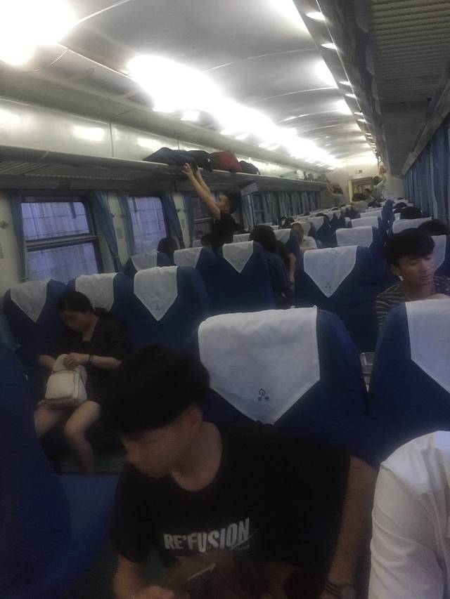 一进站发现是绿皮火车心里还是有点忐忑,小时候做绿皮火车的阴影还铭记在心,这次不知道自己要受多少苦了!不过走到硬座区的一看,心里还是很欣慰。现在绿皮火车的环境确实比我小时候印象中的好太多了!座位都是加厚的,我是有多久没做过火车了!哈哈