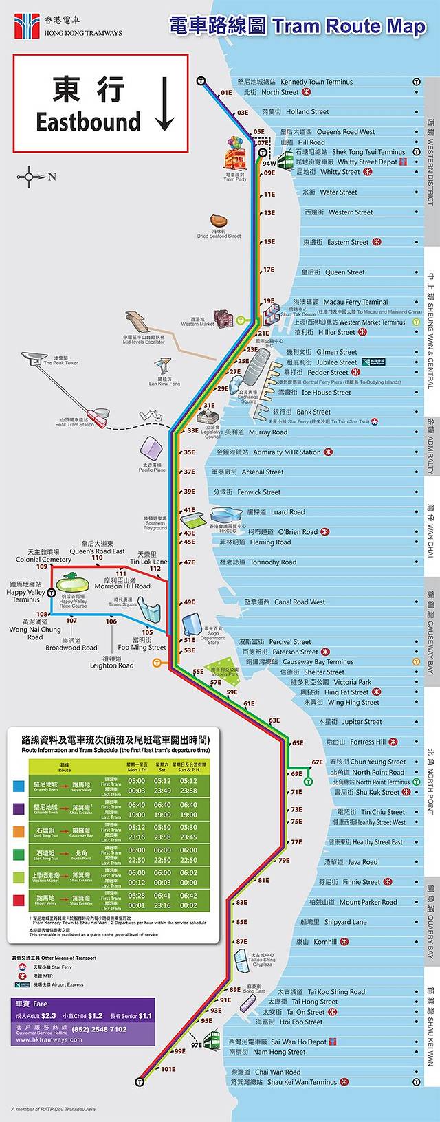 在电影或电视剧中,每当有20世纪30年代初的街头镜头,总会掠过“叮叮”车的身影,一百年前它曾是大城市里的时髦物。所以,当你置身于香港街头,突然看见一辆“叮叮”车悠哉悠哉地从你面前走过时,会突然有种恍如隔世的感觉。来香港,一定要坐一回叮叮车。成人票价是2.1港币(没记错的话),没有分段计费,下车再刷八达通。车上好像也没有报站,记住你下车的站牌就好,在二楼的话可以看到每个站牌的代号。从中环坐叮叮车到铜锣湾时代广场,大概10分钟,亲身体验这种古老的交通工具,在这个快节奏的城市中,悠哉悠哉,也是很美好的一件事。附上两张网上找到的线路图。