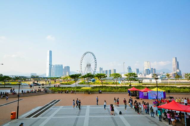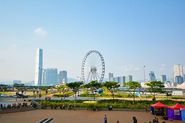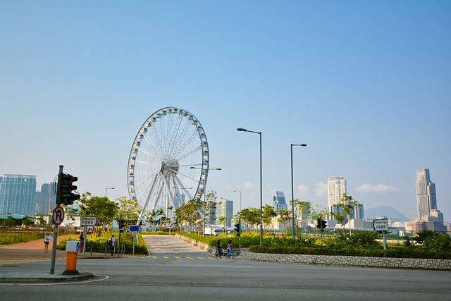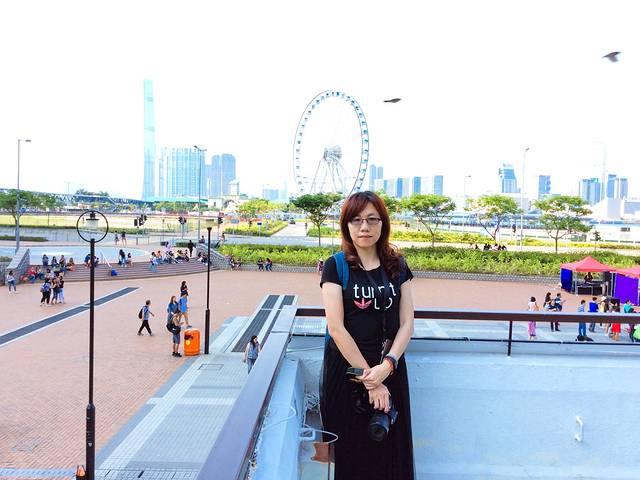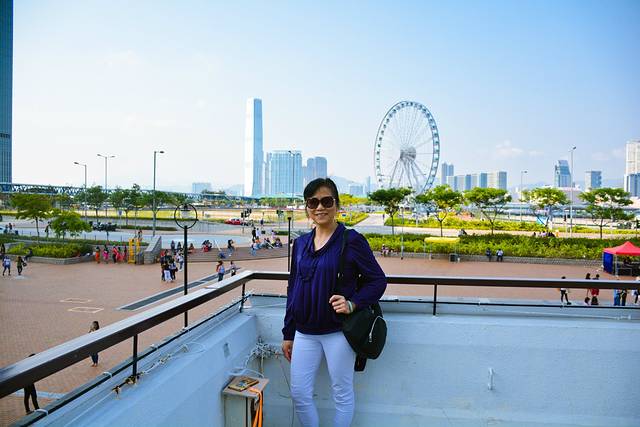 倒是发觉原来香港摩天轮就在这里,相比于其他地方的拥挤,难得在这里格外开阔的一片视野。站在香港大会堂纪念花园远眺摩天轮,景致极好。香港中环摩天轮,是香港一座高60米高的巨型摩天轮,位于中环海滨长廊上,2014年十月开幕供市民及游客付费使用。全票价是100港币/人,对于乘坐摩天轮没有多大兴致,便没有上去,远远拍照很美。游客照先来一波,觉得在拍照方面,还是老妈比较上镜呀。
