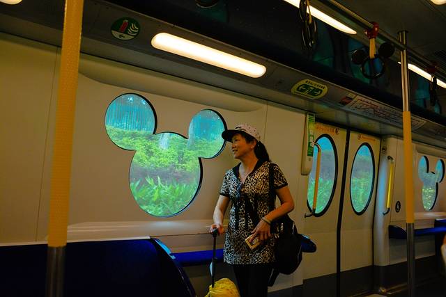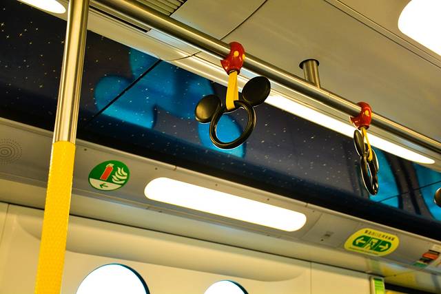 港铁佐敦-荔景-欣奥-迪士尼,20.3港币,最为特色的便是为迪士尼专门而建的港铁迪士尼线,迪士尼线列车改装后的外形设计简洁而现代化,窗户是米老鼠头形状,并以红边作装饰。车身方面,则由金色彩带及星粉图案点缀。车厢内的墙身,涂满了蓝、红、黄、紫等各种鲜艳色彩,天花也满布繁星图案。座位方面,是蓝色布料的弧形设计梳化。此外,车厢内设有米奇老鼠、米妮老鼠、唐老鸭等等16个迪士尼卡通人物的铜像,亦贴有一些关于华特迪士尼的怀念相片。至於扶手,也是米奇老鼠头形状。