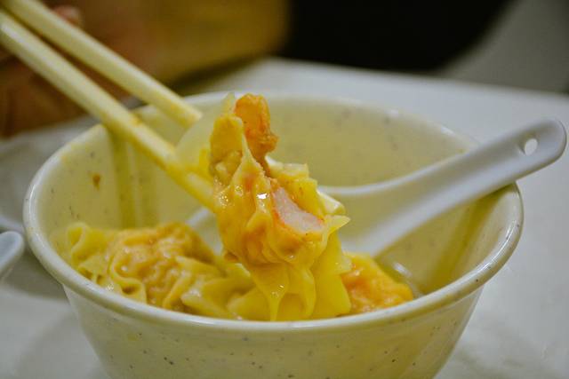 招牌是“首创全虾云吞”,跟一般与猪肉混合内馅的鲜虾云吞不同,麦文记的鲜虾云吞只包了虾子,料足味鲜美,咬一口满满都是虾肉,真的是吃得好感动。