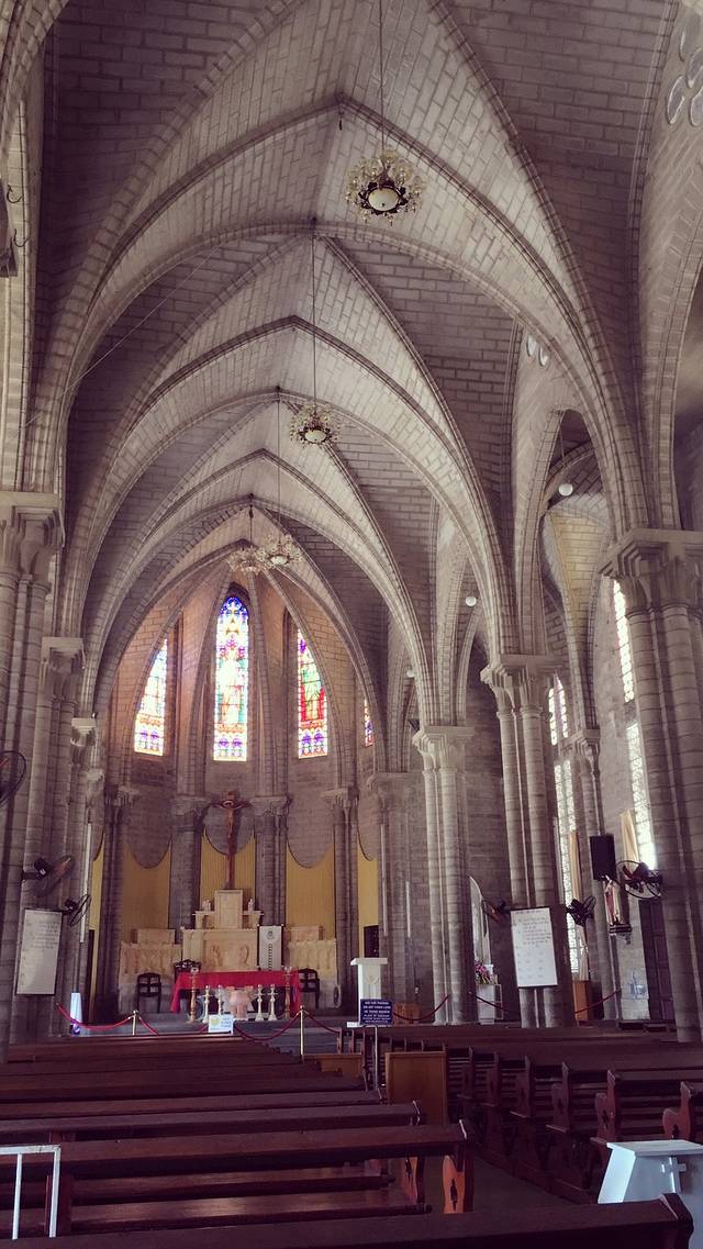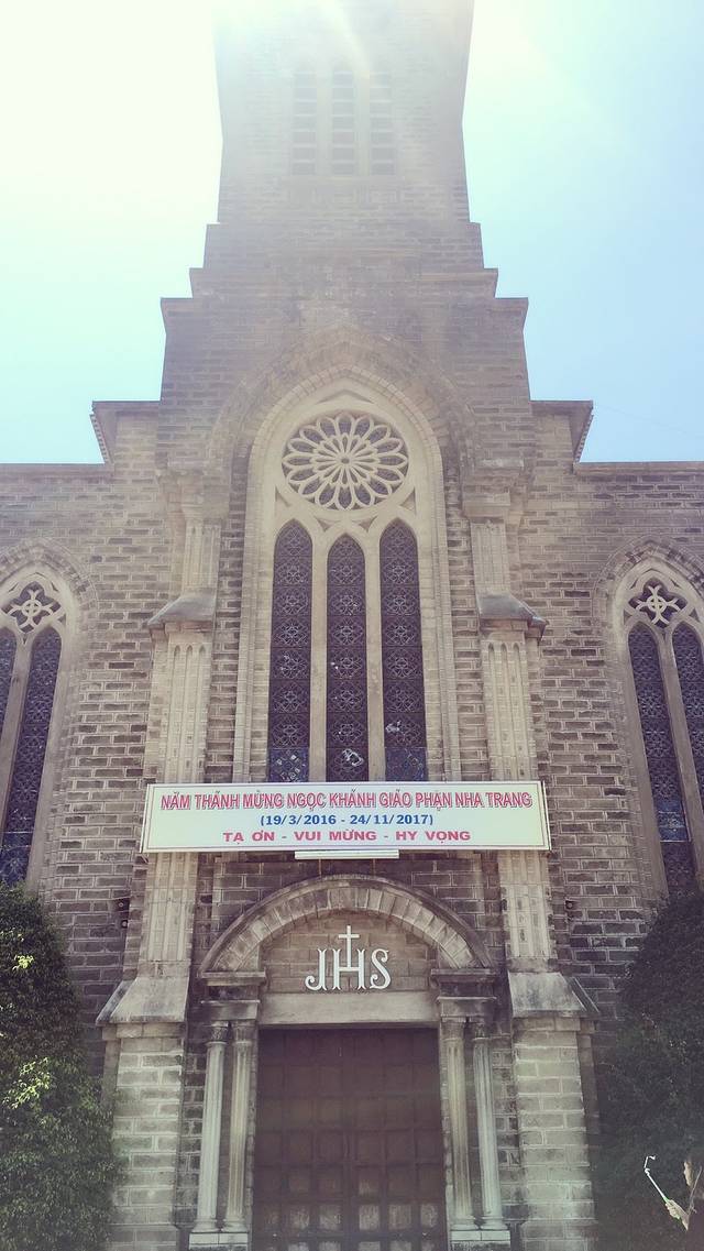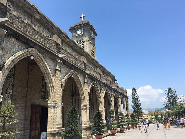 芽庄大教堂,哥特式建筑风格,建于1928-1933年,教堂有钟塔和美如锦花,绘满《圣经》的天窗玻璃。