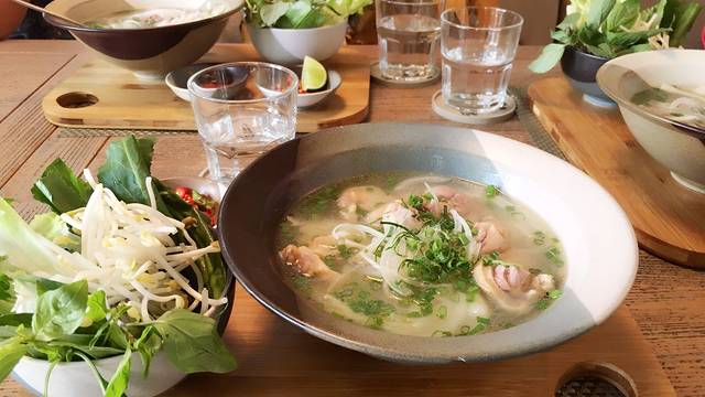 不要小看服务员刚端上来的清汤寡水一样的米粉,除了上面漂了很多的蒜末和葱末,似乎也看不出啥新意,待我挤入青柠汁,逐步放入越南调料香料以及越式辣椒🌶️,口感立马鲜活了起来,那种鲜味并不是我们日常依靠鸡精味精调得出来而能感受到的,那种口感层次的分明,每喝一口汤,让我对越南米粉更加爱得深一点。