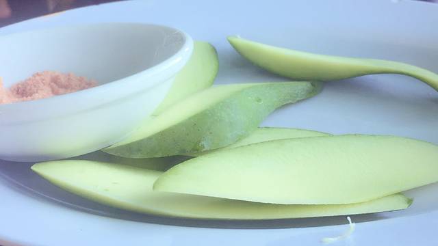 这个生芒果就是蘸着那个酱料吃,不过个人建议还是不要蘸着,蘸着吃真是齁死人。