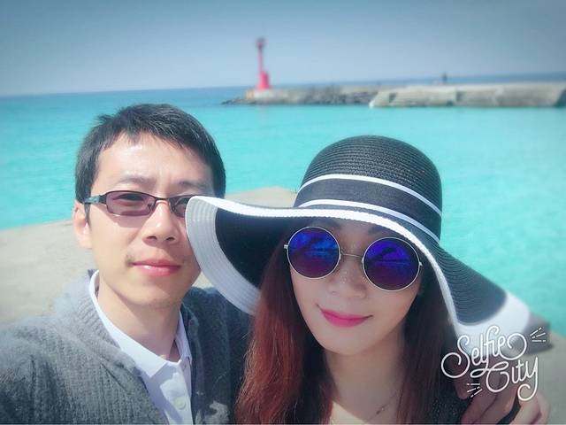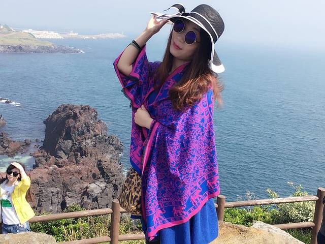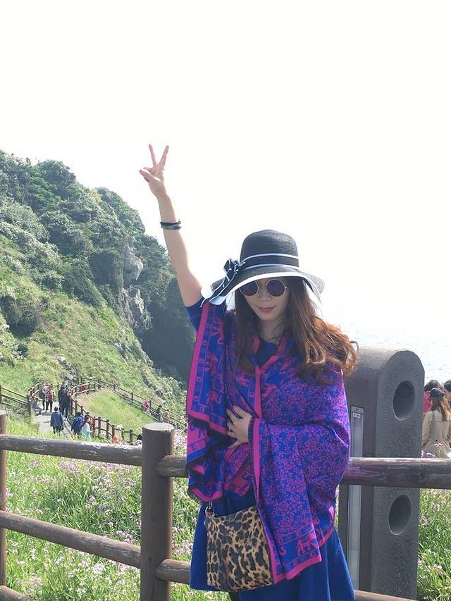 同行中的一个小姑娘,就来济州三天,明天要在济州拍摄婚纱照。今天看到我那个帽子和她的衣服蛮配的就跟我借着戴戴,我就戴着她的,这样瞬间变成了小娘惹了。
