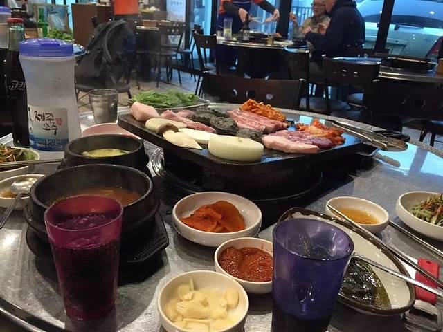 因为出发前就知道济州岛的黑猪肉很香很好吃,又在酒店周边,就用了大众点评网搜了下,最后决定去豚香气,可能还没到饭点,吃饭的人并不多,后来经过发现7点-8点之间基本上座无虚席的。菜单有韩文也有中文,不是中文和韩文分开的,不用担心会被欺骗上当的感觉。由于是两个人我们直接来了一份鲍鱼黑猪肉套餐,再加了两杯饮料,另外还赠送每人一碗的冷面。但我们烤肉吃完已经走不动路了就直接不吃了。