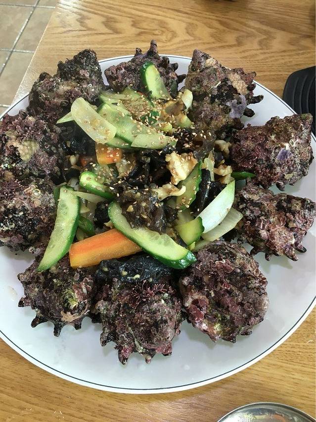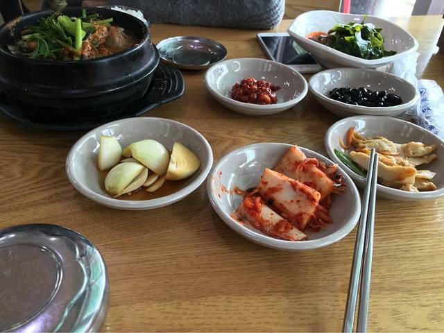吃了一个绿茶冰淇淋才心满意足的离开,果然是吃货的本质,离开时虽然还是下着一米米小雨,但既然开吃了又恰逢饭点我们就驱车去了挟才浴场附近的海鲜小店。到达看时摸不着头脑,因为都是韩文,根本看不懂,就着司机的推荐的那家就试试看味道。需要说明的是挟才浴场附近因为中国人很少去,所以基本上附近的食肆的老板和老板娘都不会说中文,甚至有时候会连英文都会沟通不畅。但老板娘很贴心,跟我们说了韩文看我们眨巴眼睛,根本不知道说的什么,就去拿了手机翻译了给我们看,很贴心。由于就两个人,我们就点了一个鲍鱼砂锅和法螺,鲍鱼砂锅其实不止鲍鱼一种海鲜,还有蛤蜊,蛏子,还有蟹等,法螺真的是我们犯囧了,以为肉在壳里,结果找了半天没有,原来是装饰,肉已经都都在菜里了,味道很不错哦。那一顿饭在韩币45000左右,还算实惠。