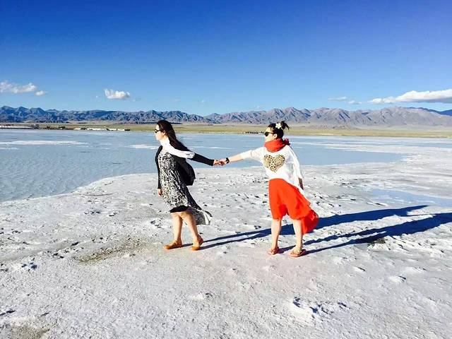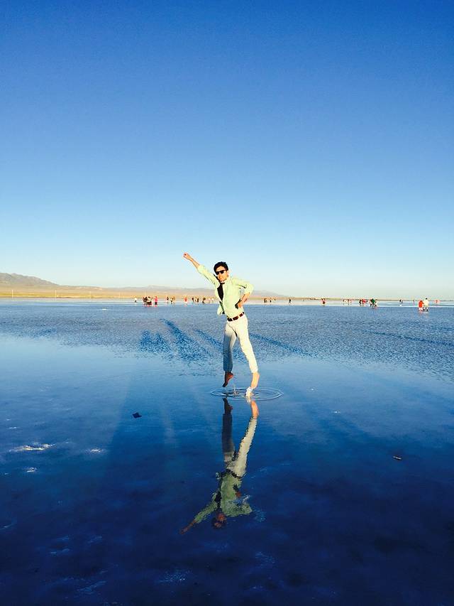 茶卡,天空之镜,其实就是一盐场。近几年,这里声名大噪,游人如织,结果大家都知道,破坏严重。白天,这里的风太大了,用曹姐姐的话说,在盐湖边吹成了傻子(电线杆都被风吹歪了)。到了傍晚,风停了,镜面效果还是不错的。只是游人较多,要拍稍微好点的图片,要往深处走。还有,盐的结晶非常刺脚,我这老皮都被刺的啊哇啊哇的直叫。