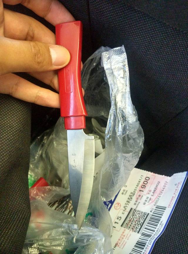 貌似很严格的安检,原本以为已经扔了的刀,居然还在带子里,且上了飞机了。此刻,我只想说,安检是装装样子的么?如果是恐怖分子,我想这把刀足矣干一番大事。