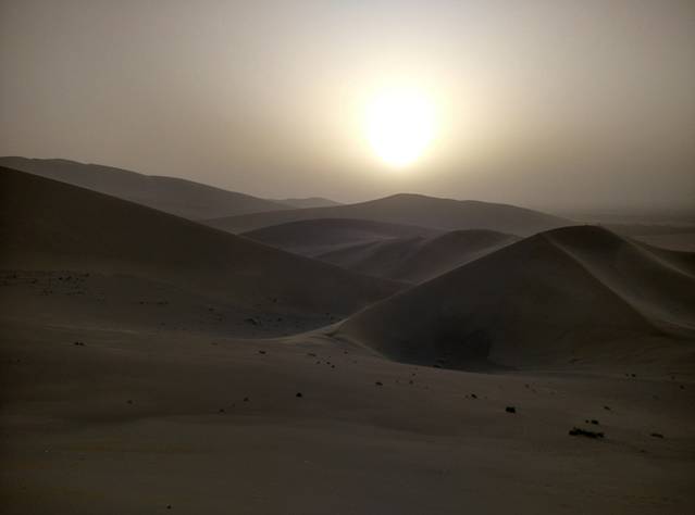 无垠的大漠戈壁,找不到方向,没有信号、无法导航,没有植物、更看不到动物,没有车、更没有人;有的,只是咆哮的狂风和无尽的黄沙,漫天飞沙。真的是好一个狂风戏沙,沙虐人。