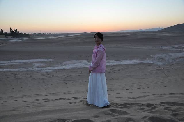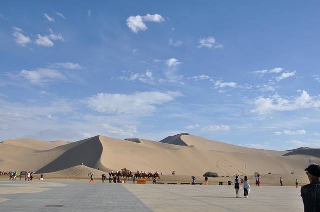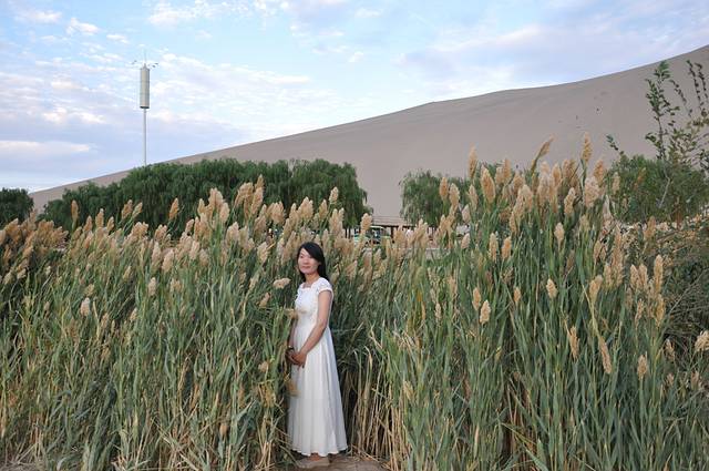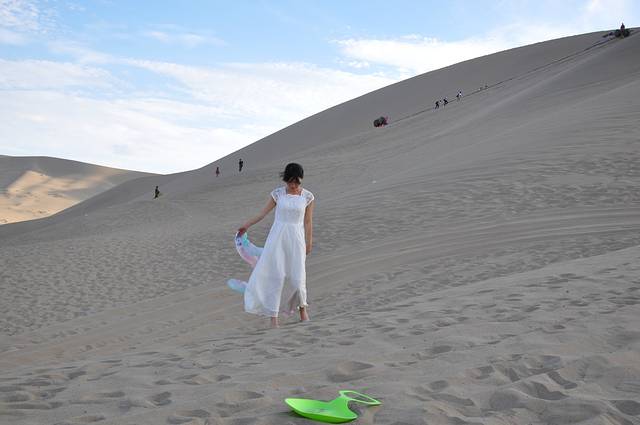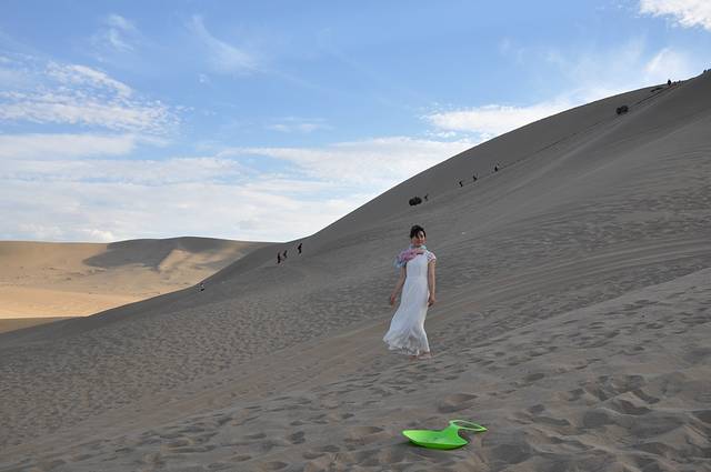 茫茫大漠中那座神奇的鸣沙山是我惦念已久的。微风佛过,撩起层层沙,如雾如烟,又如一张张重叠的纸,记载着历史的厚重。“山泉共处,沙水共生”,堪称奇观。垄垄沙山相衔,远看连绵起伏如同虬龙蜿蜒,又似海涛翻涌,甚为壮观。在鸣沙山,我喜欢赤脚行走,光着脚丫子漫步在鸣沙山,是种人生享受。沙质太过细腻,比沙滩边的沙粒不知要细多少倍。直到现在,相机的镜头盖里还残留着鸣沙山的沙子,那条白色裙子里还依稀可见沙粒。我们带着滑沙板进来还被好多大婶笑话,说我们还小吗,这是小孩子玩的,可我们就是童心未泯啊,且玩的不亦乐乎呢!一个人坐在滑沙板上,另一个人(力气大点,最好是男生)在后面用劲朝前推,你一下子腾空飞起了,那感觉怎一个“爽”字了得。