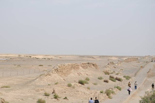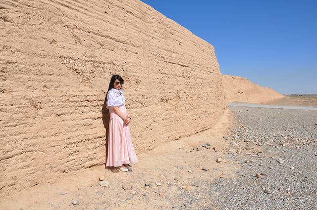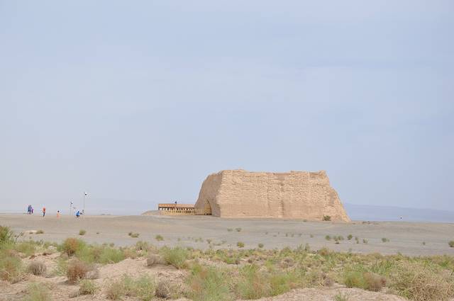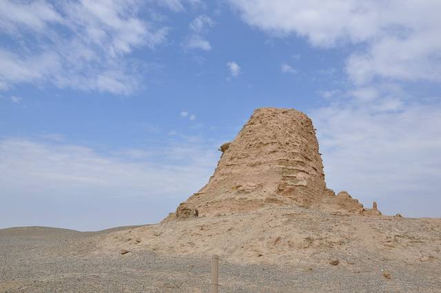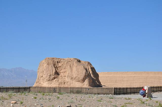 沿着西千佛洞一直向西走去就到了世界文化遗产——玉门关、汉长城、河仓城。经过历史沙尘的洗礼,曾经宏伟的玉门关早已灰飞烟灭,如今只剩下一座名叫“小方盘城”的黄土城。伫立在面前,悲壮感油然而生,这孤城无言地矗立于烈日骄阳下,仿佛在朝代的更迭后,已厌倦了诉说,“羌笛何须怨杨柳,春风不渡玉门关”。