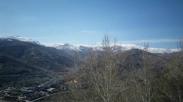 火车站门口有专门的中巴进台怀镇的,我们取得时候说刚走了一辆,刚好路过的小轿车说他得去跟上那个中巴,得把东西给他们,所以顺道把我们捎过去了,很幸运。中巴在加油站加油,我们就换坐中巴进山。中巴开始盘山路上山,越来越高,都开始看到雪了。开了有一个小时后,到达鸿门岩。之前在各种攻略中看到,如果要大朝台可以从这里下,让后从东台开始看,但是我们一看满山都是雪,而且还背着打包,还是算了,先进镇里放下包再说。