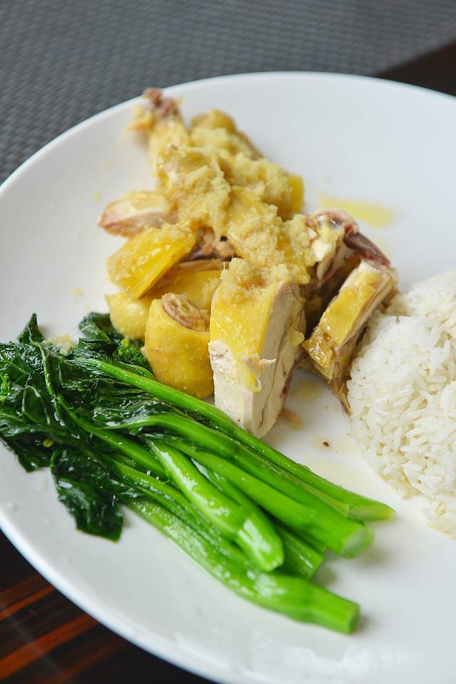 将整只鸡蒸熟斩件上碟,鸡味浓郁、鸡皮晶莹如同凝脂。在粤语中,“蒸”与“晶”发音相像,所以又名“水晶鸡”,它与传统的白切鸡做法
