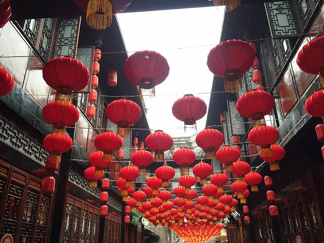 锦里的历史,最早可追溯到秦汉。很久很久之前,这里是西蜀历史上最古老,最繁华的街道,离武侯靠的很近。据说早在秦汉,三国就闻名。在这里我看到的是一片红灯笼,还有那瞩目的战旗。可惜这里的商业度比宽窄巷子还浓,冗杂的步行街。或者更贴切的说是美食一条街。