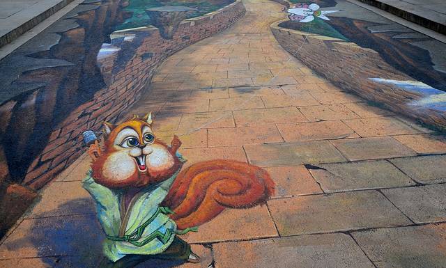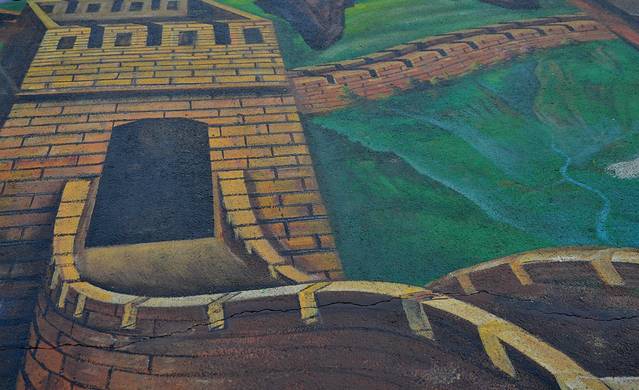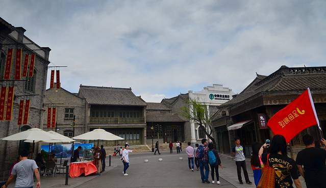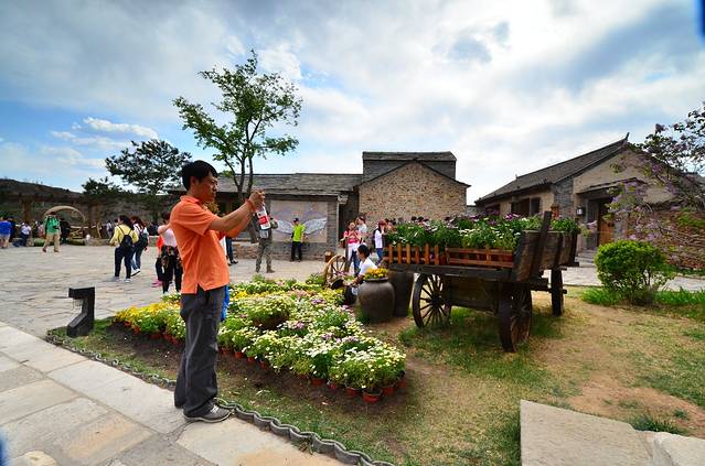 顺着景区的指路牌和人流,我们的队伍三三两两地前往大门口集合,等待领发门票。这1点几公里的景区内外的过渡区需要步行,好在沿途已经有了古城和水镇的感觉,脚下不留神还踩踏了艺人大师的街头涂鸦,大家忙不迭掏出相机手机拍照,倒也没觉得太累。