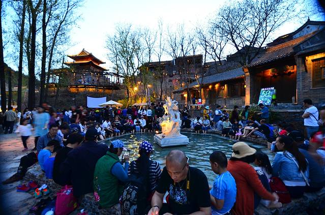 我仔细看了看手表,古北水镇在4月中的掌灯时间是19点左右。19点景区内的音乐喷泉正式开始表演,很多游客涌向喷泉广场。我们到的时候,前面已经被工作人员圈了三拨儿游客了。