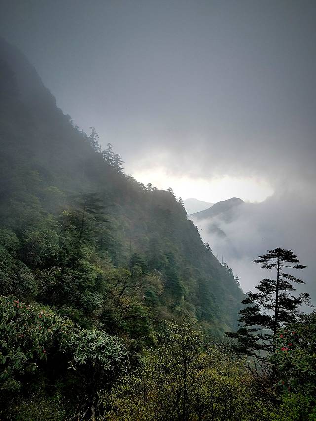 我们走到了半山腰,不时会有人停下脚步休息,放下背包分享自己携带的零食。昱昱缺乏户外经验,我安排走在队伍中间的喜鹿照顾她,虽然缺乏经验但她非常有毅力不怕艰险,最后是坚持走完了全程。蜗牛、莎子和小草也走在队伍的中间,不时给大伙加油鼓励,是队伍是不可缺少的精神支柱。邵兵在前面开路,他是一个手机摄影爱好者,一路上给大家拍照,分享各种照片。山上的杜鹃花,红似云霞,身至其中,竟不知先抚摩那一树,不知先亲吻那一丛,惊叹中,只想把自己融入花丛,与它合为一体。