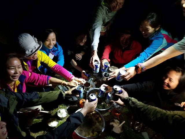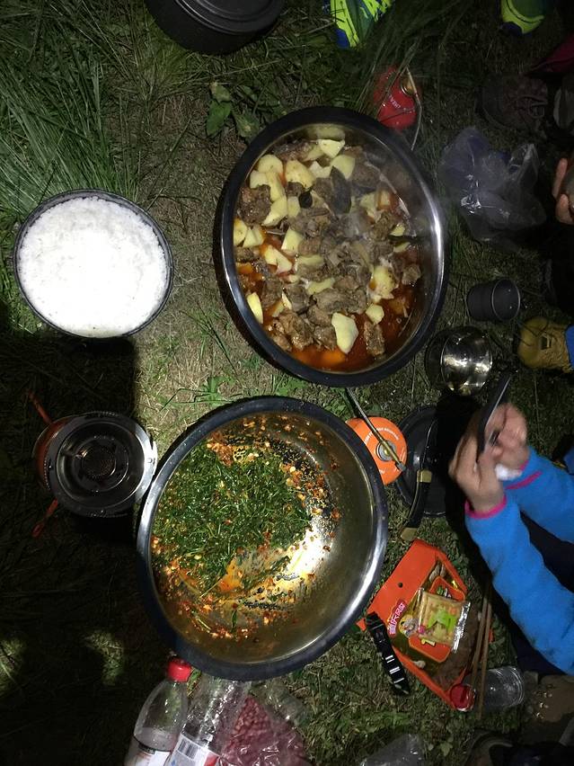 上车没多久,大家开始分享自己的户外经历,交谈甚欢,经过几个小时的车程我们到达江口县城。午饭后稍作休息,下午三点我们包车到达梵净山东线大本营,泡木坝村徒步登山的起点,当晚,我们就扎营在泡木坝村旁边的河岸上。旁晚大家互帮互助一起生火造饭,煮饭、洗菜、山上找野菜,一份野味十足的大餐在欢声笑语中出炉。灯火摇曳,光影晃在每个人的脸上,我们数着星星对酒当歌,笑看人生。墨墨、小草、灰狼、莎子、喜鹿、昱昱、蜗牛、邵兵、素言、飞鱼,一群有着共同喜好的人,组成了一个温馨的大家庭。