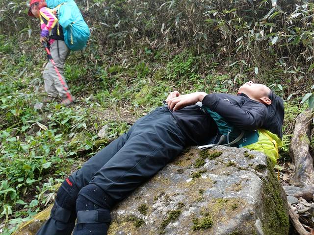 下午四点,我们路过薄刀岭,那是个比较危险的地方,需要在悬崖峭壁上攀爬,坡度大概80度左右,辉郎和素言缓慢爬过危险区后,转身协助大家安全度过这个危险的地方,这次活动他俩为我们这个团队贡献了很多。当前面的大部队都已经爬过了薄刀岭,而我跟墨墨还走在队伍的最后面,与他们相差可能半个小时左右的路程,在路上我不时会对墨墨说一句,“快走啊再不走我就打死你”,这句话至今她都还铭记在心,为什么我会这样说她,其一是以前曾经参加过话剧有这个桥段,已经变成了我口头禅,其二是她没走多远就会停下来,放下背包休息,我们都还没有过薄刀岭呢,和前面的队伍距离拉得实在是太长了,不能按时到达营地就会变得危险,我内心十分的着急。后来在山上我答应她,下山以后我给她买冰冻的红牛,然后微信给她发200的红包,就这样我们才能坚持过了薄刀岭。我们走过了几个山脊后,放下背包休息,墨墨分享了她唯一的一支能量胶,我俩每人一半,吃了能量胶感觉整个身体瞬间能量爆炸。