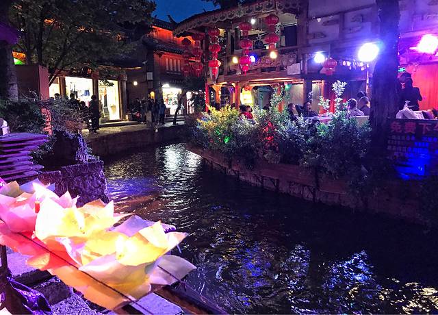 丽江古城在18:30之前进入要收古城维护费,80/人,所以白天基本没什么人逛。18:30一过古城开始喧嚣起来,各种饭店、商店、酒吧,吆喝声四起,非常热闹。古城里还是很大的,逛着逛着就迷路了,而且它的路牌基本上也看不懂。最简单的方法,就是手机导航,比什么地图都好使。